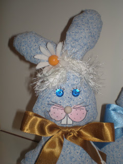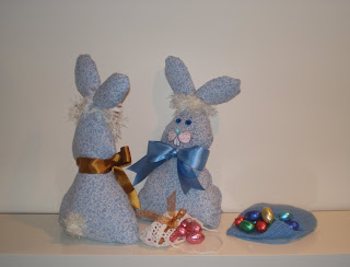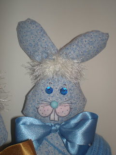 Fiz uns simpáticos coelhinhos para oferecer à minha mãe e à minha madrinha. Depois de costurar, encher e decorar os coelhos, fiz duas malas em lã e linha (em pontos "abertos e fechados") para os coelhos levarem ovinhos de chocolate.