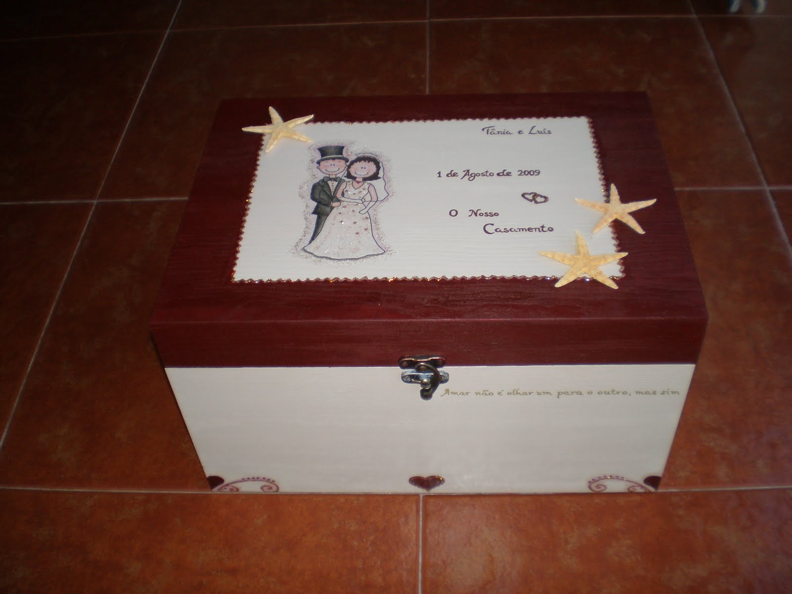 A decoração desta caixa teve por base a temática da festa e de todos os elementos que a envolveram. Aliás, a tampa só não é uma réplica do convite de casamento porque no convite os noivos não tinham o fato e o vestido de noiva; de resto (cores, letra e moldura com efeito recortado), tudo está feito à imagem do convite.